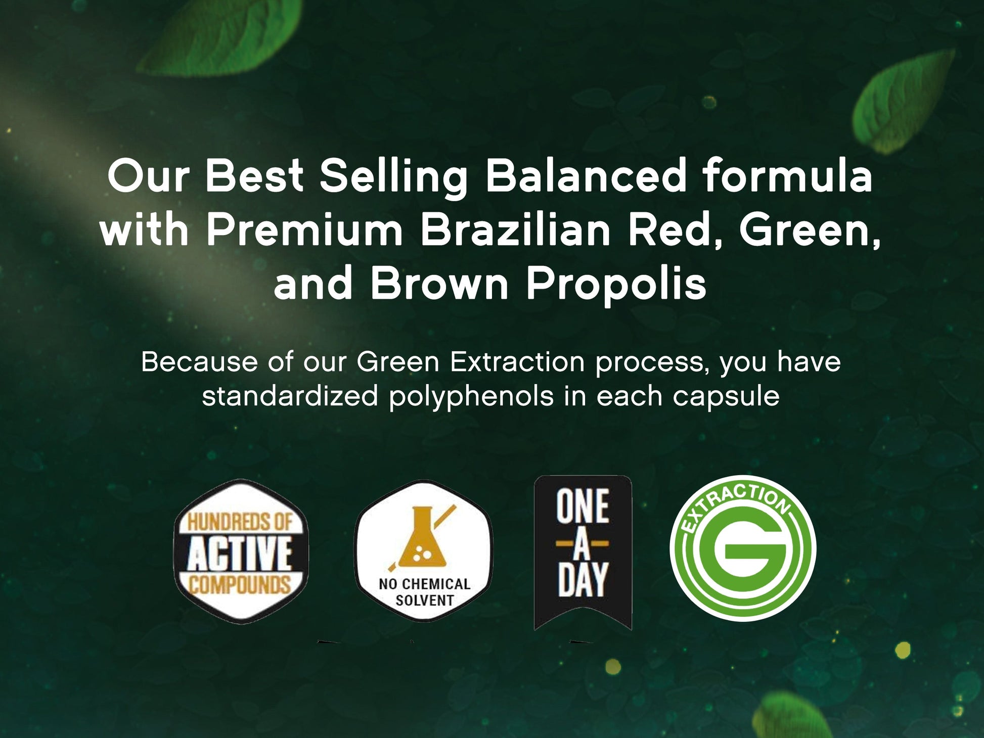 This is the first one-a-day Brazilian Bee Propolis formula with equal and balanced doses of Brazilian red, green and brown Propolis.