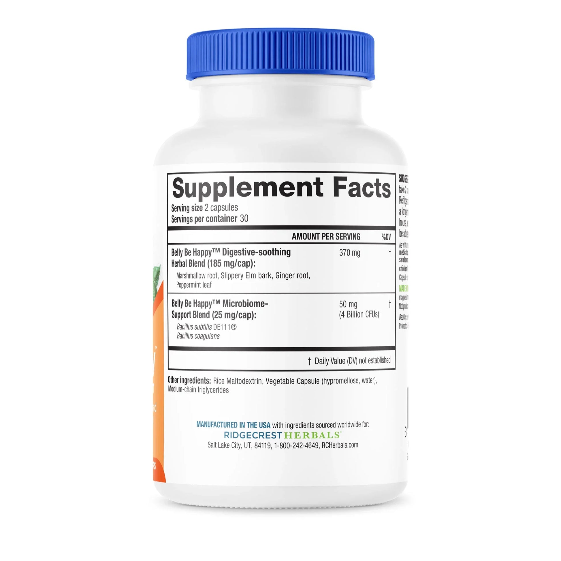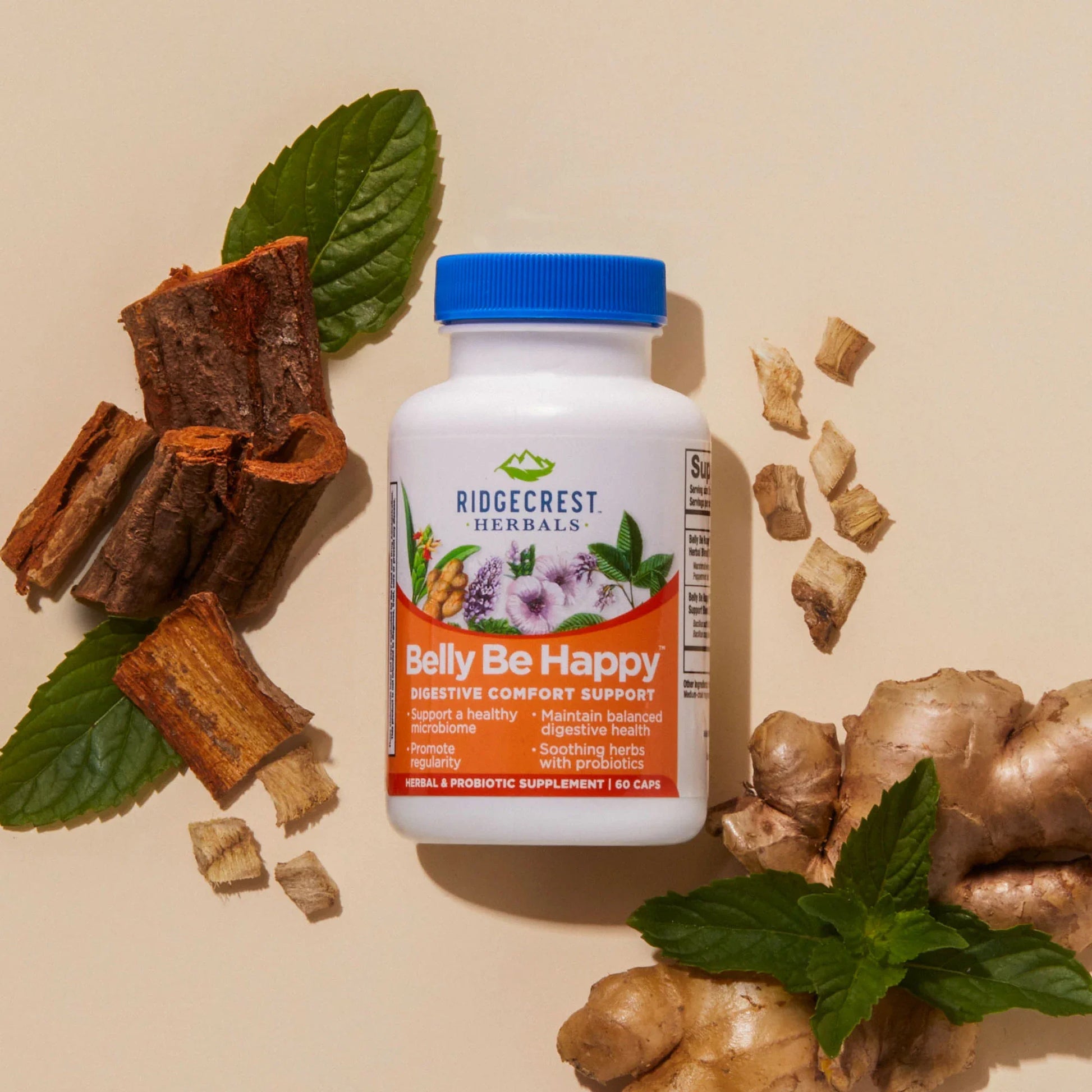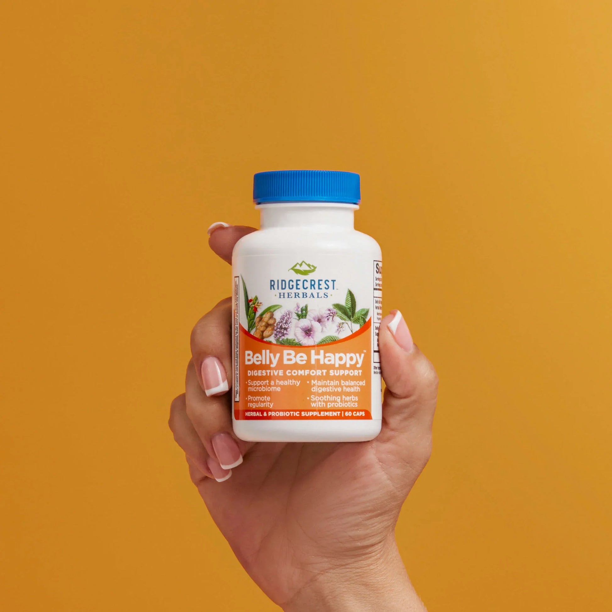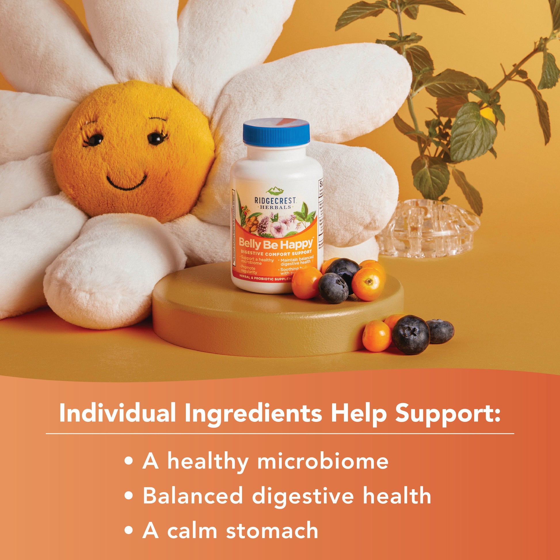 Belly Be Happy® combines gentle herbs like Ginger, Marshmallow, Slippery Elm, and Peppermint with two strains of probiotics for everyday digestive comfort. These soothing herbs and probiotics help support a healthy microbiome, balanced digestive health, and a happy belly. This product is best for those who enjoy a calm belly and do not need digestive enzyme support.
