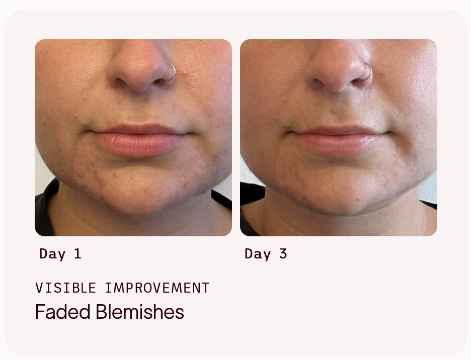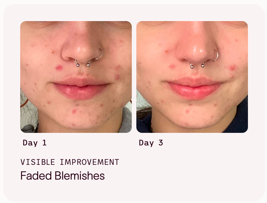 Step 1:Treat with Light Therapy – On clean, dry skin, place the Bye Acne device over the breakout and turn on. Hold in place until the 3-minute treatment ends automatically.