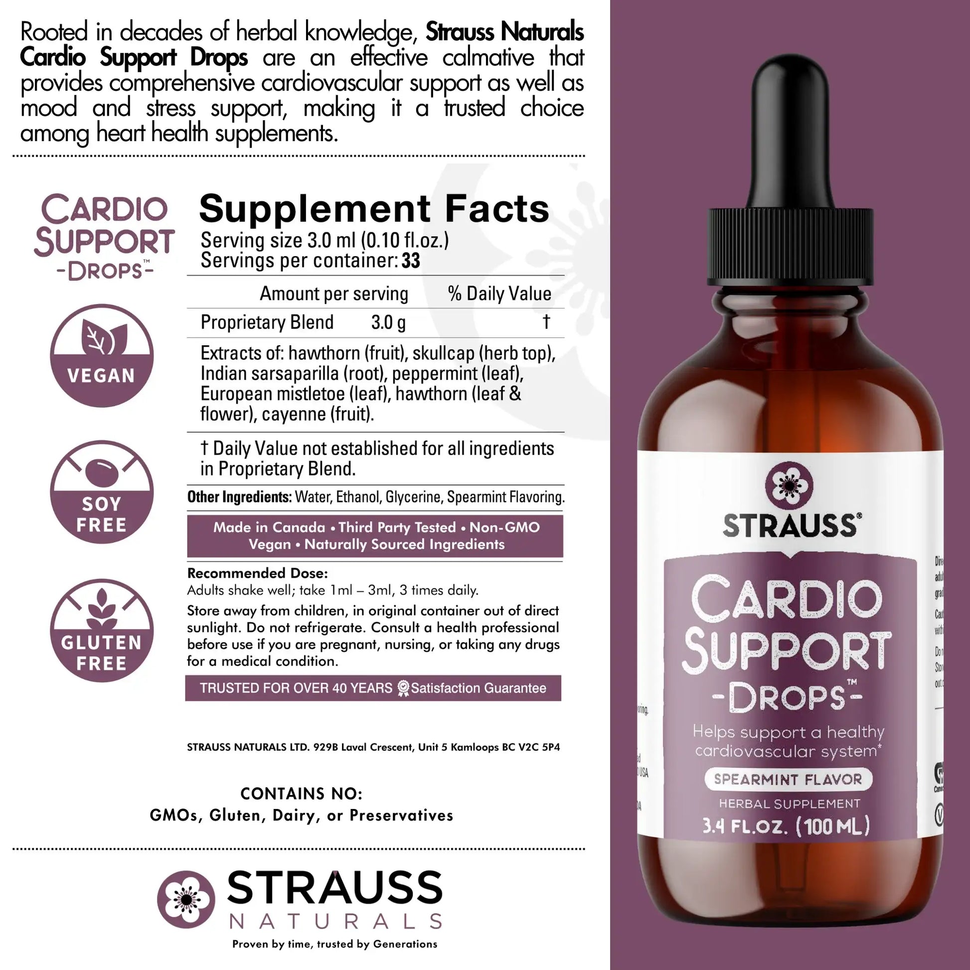 This traditional herbal formula contains seven heart-friendly herbs, such as Hawthorn and European Mistletoe, and has been developed with decades of herbal expertise. Its natural formulation makes it an ideal cardiovascular supplement for both men and women. It also includes extracts of supportive herbs like Skullcap Herb Top, Indian Sarsaparilla Root, Peppermint Leaf, and Cayenne Fruit, all combined in an easy-to-take liquid formula in a refreshing Spearmint flavor.