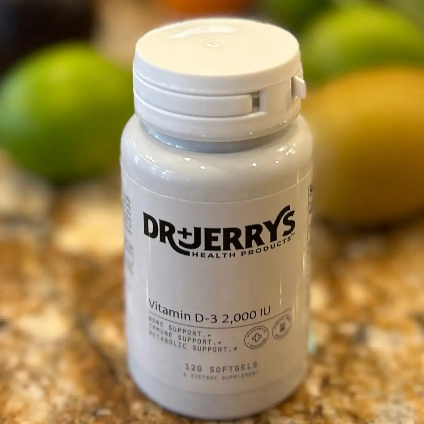 Boost your bone health, immune system, and metabolic function with Dr. Jerry's Vitamin D-3 2000 IU softgels. Scientifically formulated to provide essential vitamin D-3, each bottle contains 120 softgels for long-lasting support.