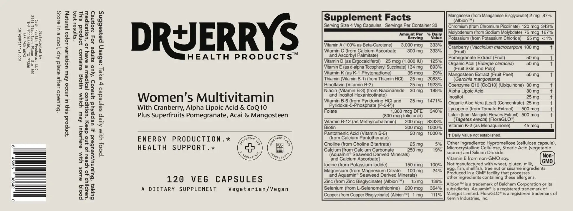 Boost your energy and support your health with Dr. Jerry's Women's Multivitamin. This vegan formula combines essential nutrients with powerful superfruits like cranberry, pomegranate, acai, and mangosteen. With added alpha lipoic acid and CoQ10, this multivitamin promotes energy production and overall well-being.