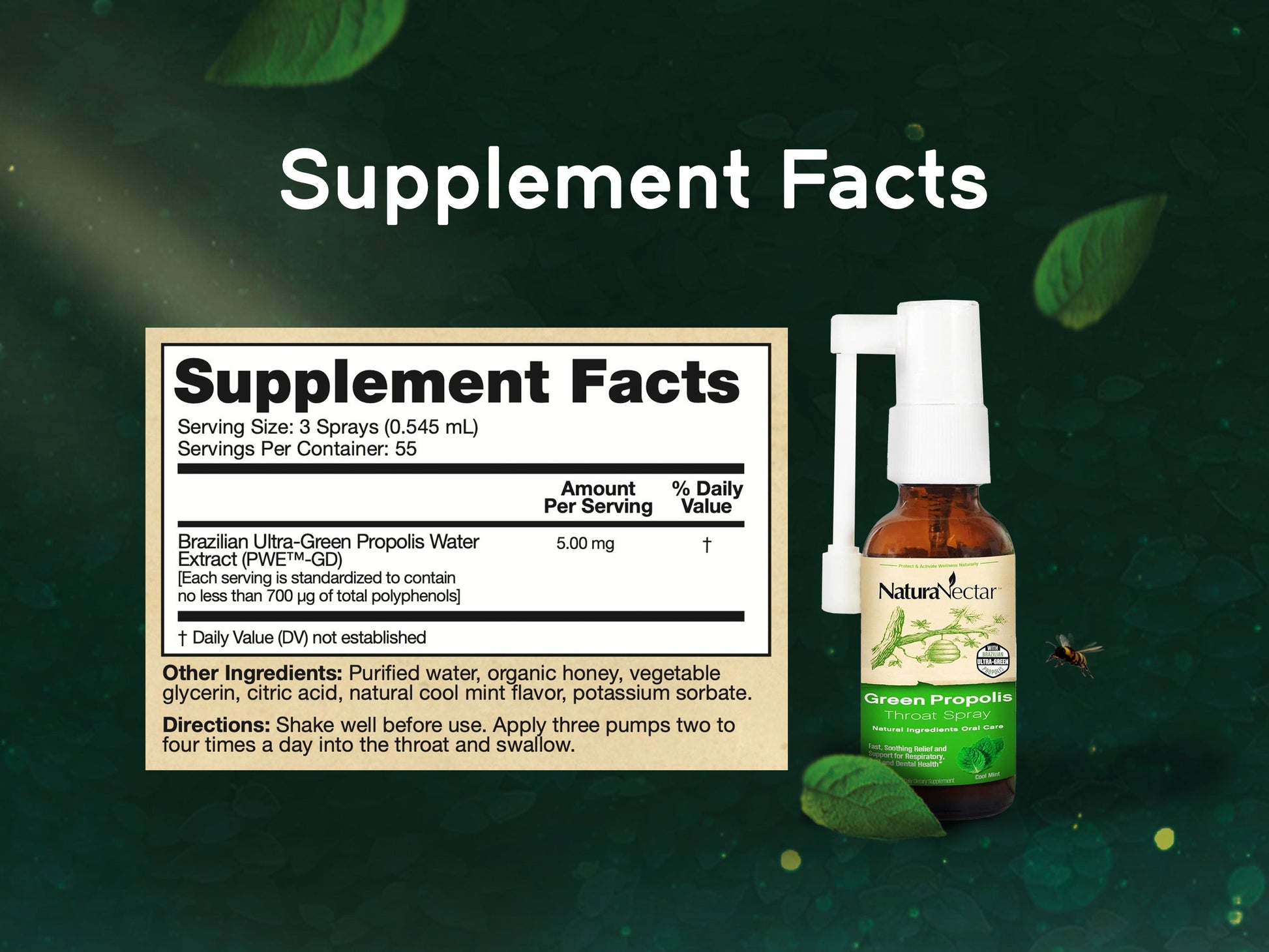 NaturaNectar Green Propolis Throat Spray is FREE of alcohol and propylene glycol made from the well known Brazilian green propolis. It can be enjoyed by the whole family† in a refreshing cool mint flavor.†