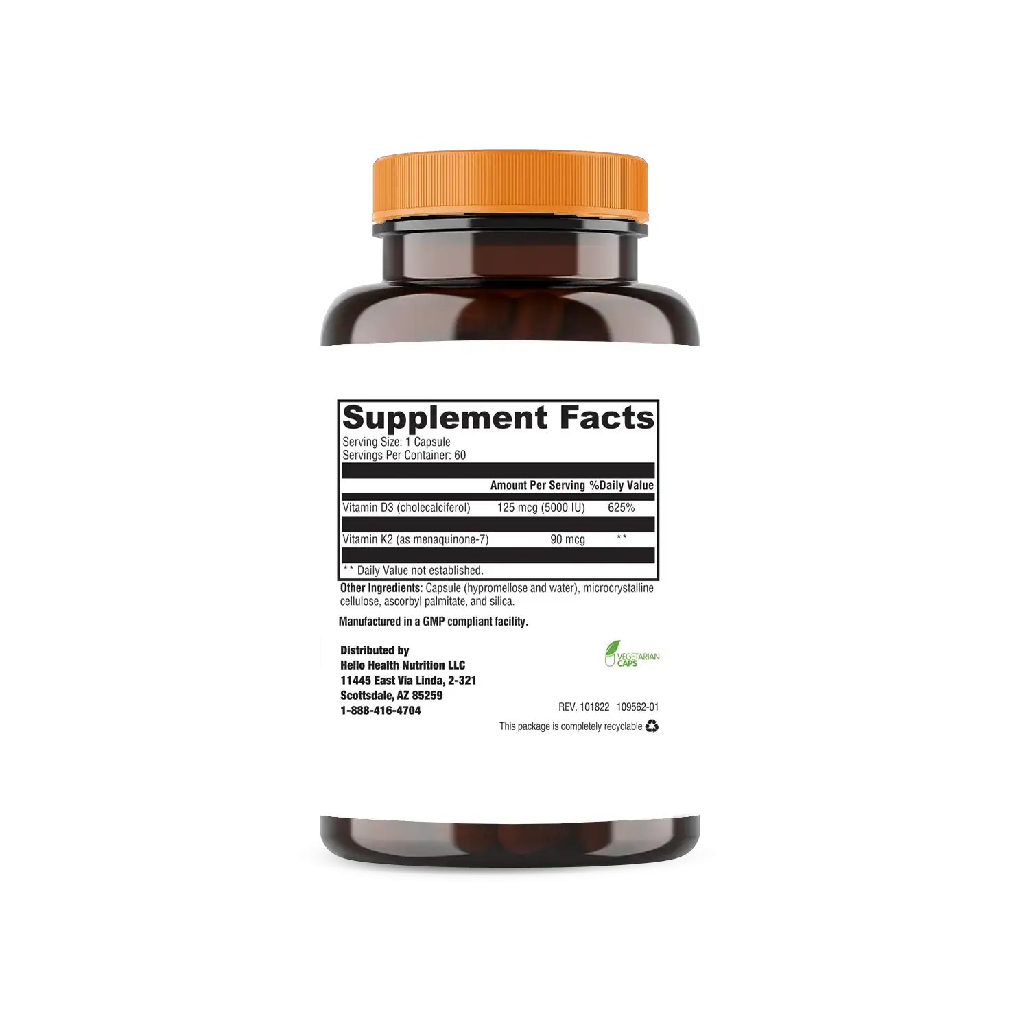 K2-D3 5000 features the most bioavailable and bioactive form of supplemental vitamin K2 available and vitamin D3 (cholecalciferol), the identical form in which vitamin D is derived in the body from cholesterol and synthesized by sunlight on the skin. Studies confirm safety and efficacy for bone and heart health.*