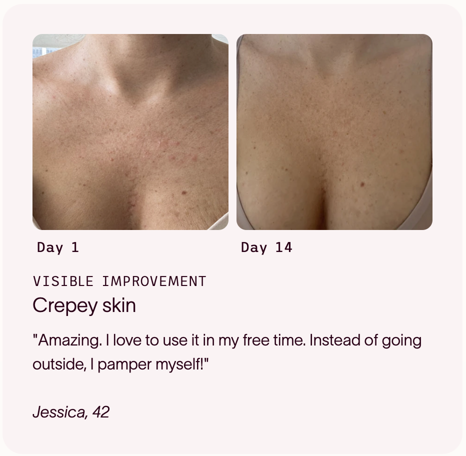Use 3x a week for 8 weeks to visibly tighten sagging, smooth wrinkles, and even tone and dark spots on your neck and chest.†