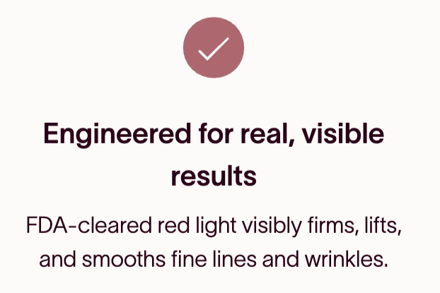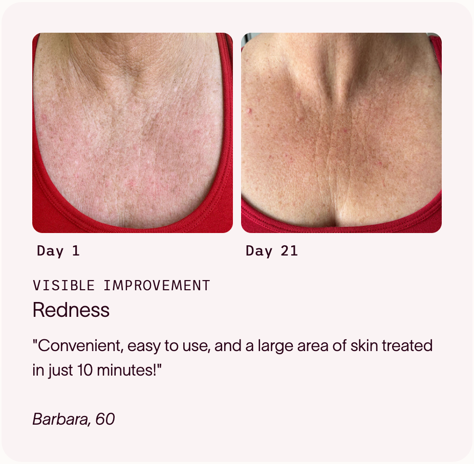 Red (630nm) and Near-Infrared (830nm) Light Therapy work together to help visibly improve firmness, smooth fine lines, and even skin tone in just 10 minutes per session.