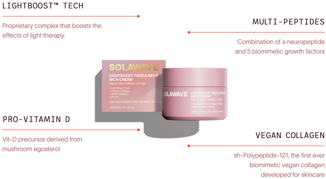 LightBoost™ Face & Neck Rich Cream IngredientsWater (Aqua), Ethylhexyl Palmitate, Squalane, Simmondsia Chinensis (Jojoba) Seed Oil, Isononyl Isononanoate, Glycerin, Caprylic/Capric Triglyceride, Pentaerythrityl Tetraisostearate, Methyl Glucose Sesquistearate, Arachidyl Alcohol, Dimethicone, Cetearyl Olivate, Butyrospermum Parkii (Shea) Butter, Sh-Polypeptide-121, Acetyl Hexapeptide-8, Polyglutamic Acid, Ceramide NP, Chlorella Sorokiniana Extract, Sh-Oligopeptide-1, Sh-Oligopeptide-2, Sh-Polypeptide-1, Sh-Polypeptide-11, Sh-Polypeptide-9, Pentapeptide-4, Lindera Strychnifolia Root Extract, Sodium Hyaluronate, Phytosterols, Ubiquinone, Sea Kelp (Lactobacillus/Kelp Ferment Filtrate) Bioferment, Tranexamic Acid, Acetyl Glutamine, Fucoxanthin, Astaxanthin, Bacillus/Folic Acid Ferment Filtrate Extract, Polyglyceryl-4 Caprate, Behenyl Alcohol, Benzyl Alcohol, Sorbitan Olivate, Sodium Stearoyl Glutamate, Cetyl Alcohol, Silica, Glyceryl Behenate, Arachidyl Glucoside, Acrylates/C10-30 Alkyl Acrylate Crosspolymer, Maltodextrin, Lecithin, Dehydroacetic Acid, Sodium Phytate, Sodium Benzoate, Caprylyl Glycol, 1,2-Hexanediol, Dipropylene Glycol, Butylene Glycol, Potassium Sorbate, Hydroxypropyl Cyclodextrin, Porphyridium Polysaccharide Gel, Lactic Acid/Glycolic Acid Copolymer, Polyvinyl Alcohol, D-Arginyl Tyrosinyl Ornithinyl Phenylalanine.