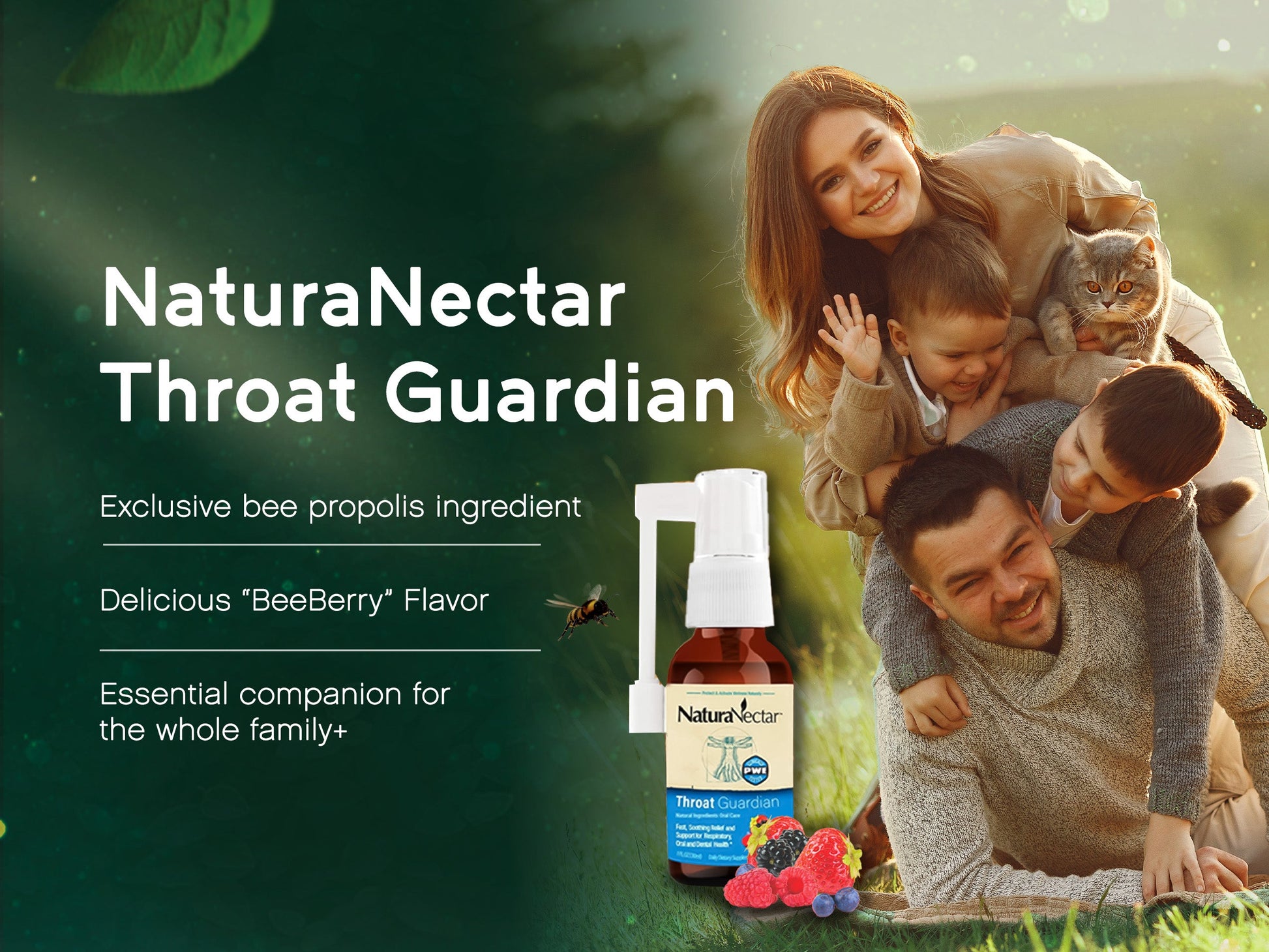 Throat Guardian™ is NaturaNectar's bee propolis throat spray FREE of alcohol and propylene glycol that can be enjoyed by the whole family† in a delicious natural berry flavor.† Go through the changes of seasons with your best companion. Throat Guardian's propolis is extracted with NaturaNectar's Green Extraction which is a water based method delivering a standardized amount of healthy organic aromatic acids from a Brazilian propolis blend.