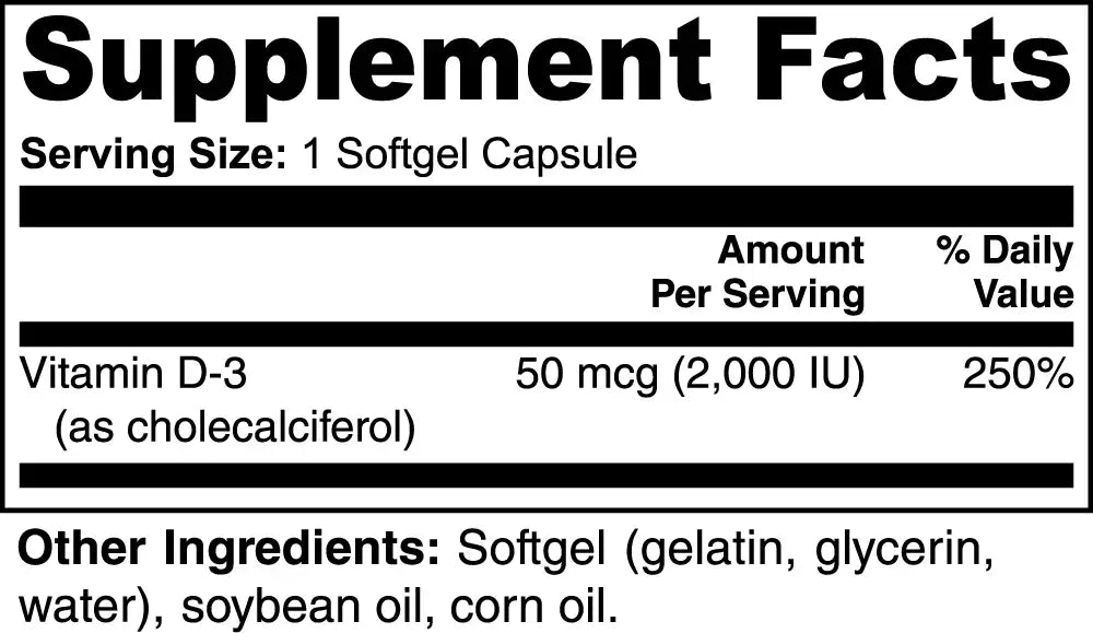 Ingredients: Vitamin D3 (as cholecalciferol), Softgel (gelatin, glycerin, water), soybean oil, corn oil.