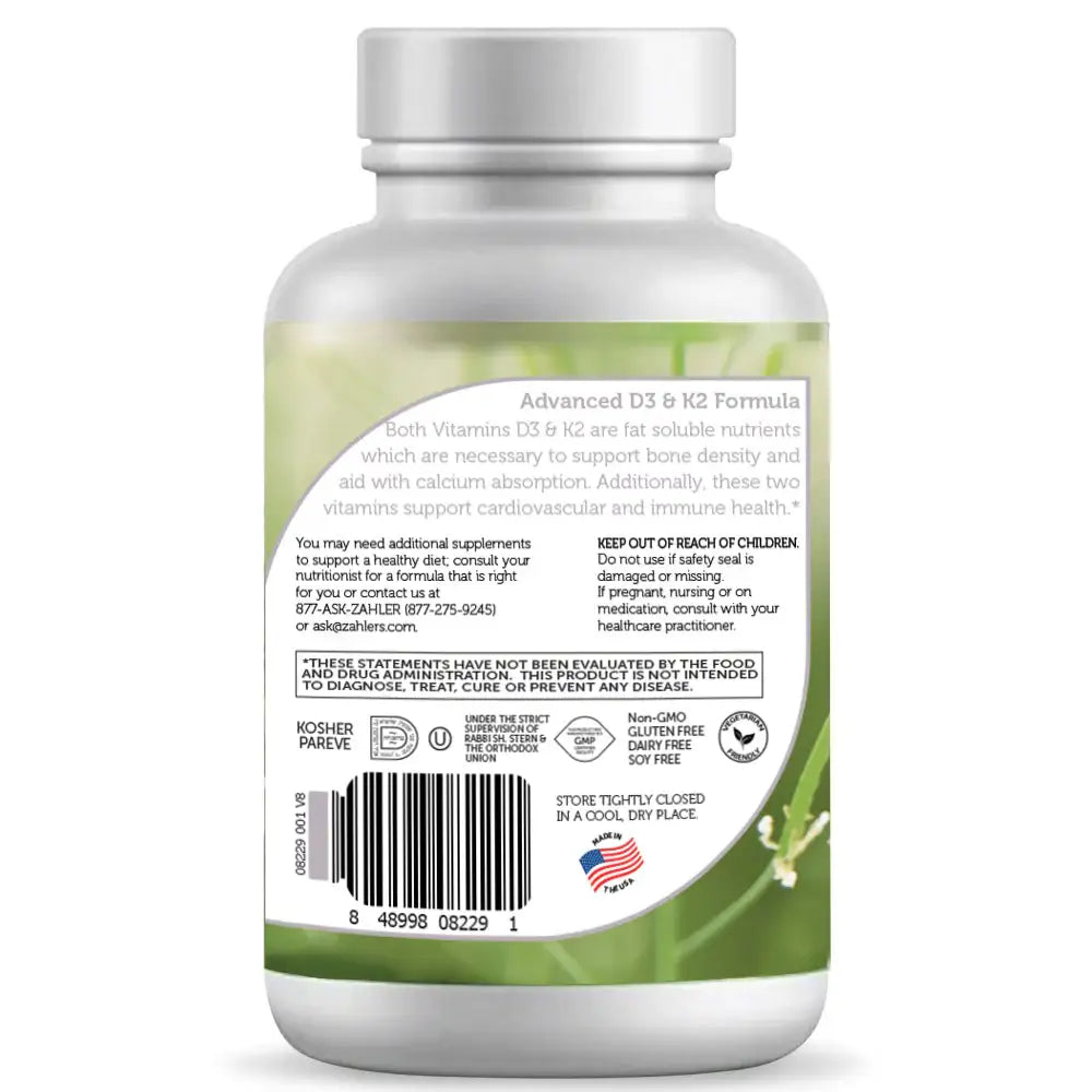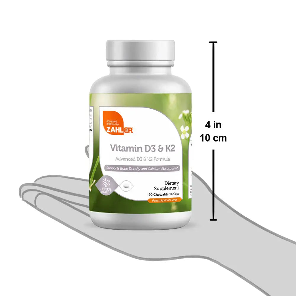 Zahler Vitamin D3 & K2 provides a robust dose of both Vitamin D3 and Vitamin K2. Vitamin D3 is a crucial nutrient for overall health, specifically maintaining strong muscles, bones, teeth and a healthy immune system. However, millions of individuals are deficient in this life-sustaining vitamin. In addition to supporting bone health‚ research shows that D3 deficiency is linked to a host of conditions that present serious health risks. Also included is Vitamin K2, which supports bone density and aids with calcium absorption. Zahler's Vitamin D3 & K2 provides all the benefits of vitamin D3 and K2 in a delicious chewable tablet.